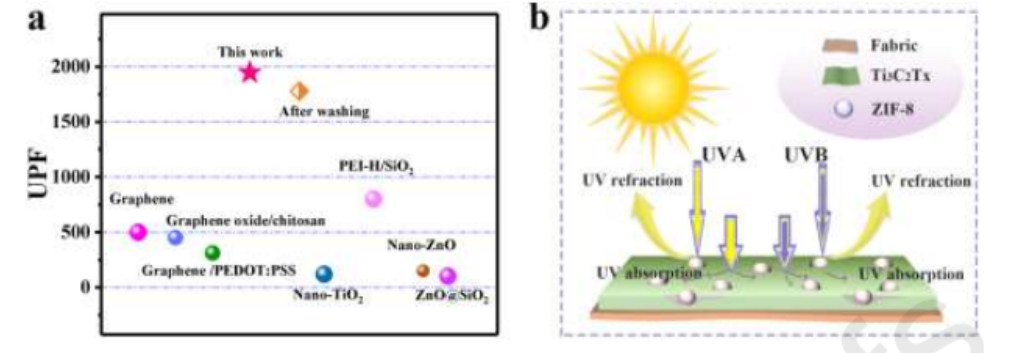 圖10。本研究與近期文獻UPF值的比較(a);MXene@ZIF-8@PPZ-C/L可能的抗紫外線機制(b)。