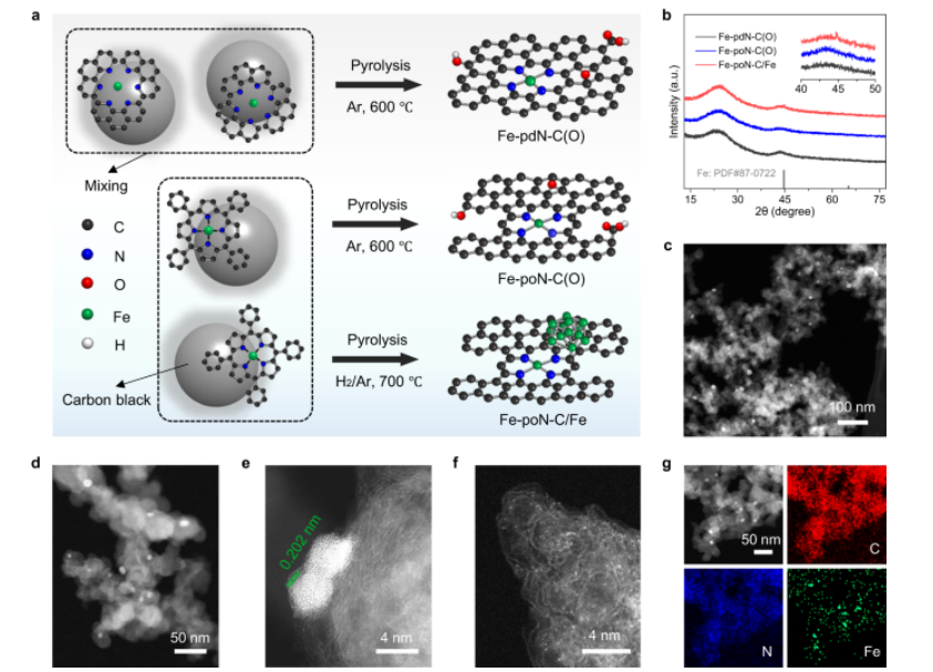 Fig 1. 催化劑的制備和表征。 a Fe-pdN-C(O)、Fe-poN-C(O) 和 Fe-poN-C/Fe 的合成示意圖。 b FepdN-C(O)、Fe-poN-C(O) 和 Fe-poN-C/Fe 的 XRD 圖譜。 (c) 大視場視圖,(d) HAADF-TEM 放大視圖,(e, f) 像差校正 HAADF-STEM,(g) Fe-poN-C/Fe 的 EDS 圖。