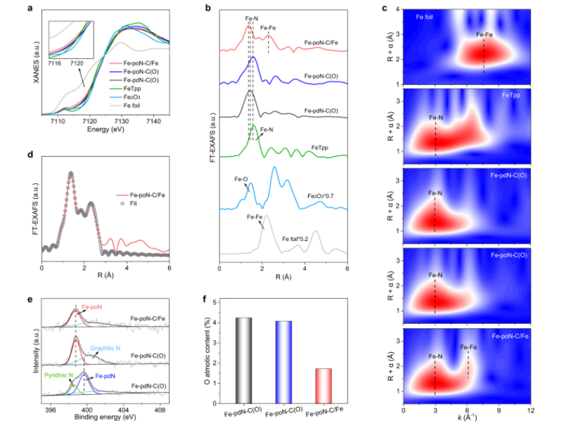 Fig 2. X射線吸收光譜和X射線光電子能譜分析。 Fe-pdN-C(O)、FepoN-C(O) 和 Fe-poN-C/Fe 與參考樣品的 Fe K 邊緣的 (a) XANES 和 (b) FT-EXAFS 光譜。 (c) Fe 箔、FeTpp、Fe-pdN-C(O)、Fe-poN-C(O) 和 Fe-poN-C/Fe 的 WT-EXAFS 等值線圖。 (d) Fe-poN-C/Fe 的 FT-EXAFS 擬合曲線。 Fe-pdNC(O)、Fe-poN-C(O) 和 Fe-poN-C/Fe 的 (e) N 1 s 譜和 (f) O 原子含量。