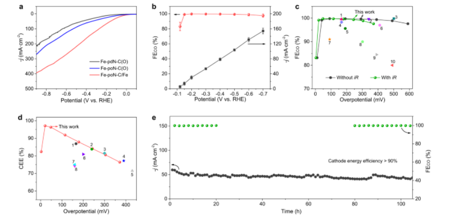 4 位點(diǎn)和低氧碳載體組成的混合電催化劑,該催化劑在 21 mV 的超低過電勢下表現(xiàn)出超過 99% 的顯著 CO 法拉第效率,達(dá)到最高的陰極能量迄今為止,效率高達(dá) 97.1%。該催化劑還可以提供接近 100% 的 CO 選擇性,并具有至少 100 小時(shí)的高陰極能量效率 (>90%)。對照實(shí)驗(yàn)、原位表征和理論計(jì)算的綜合結(jié)果表明,引入Fe納米粒子可以通過加速質(zhì)子從CO