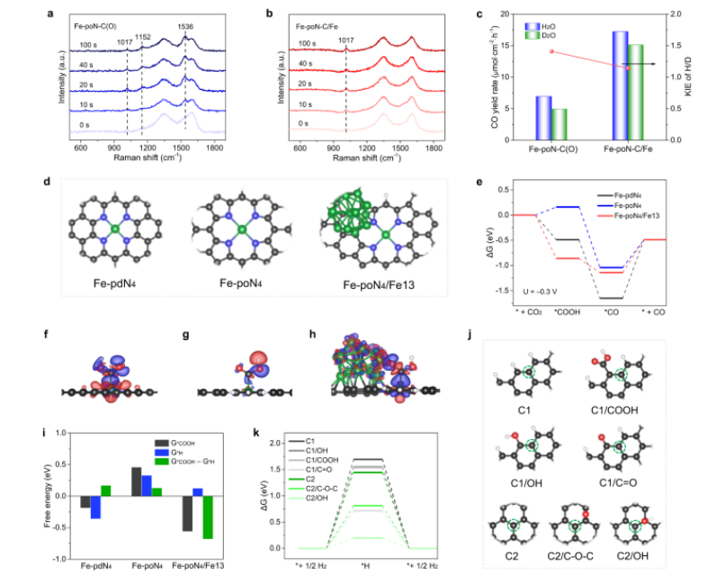 Fig 5. 使用原位拉曼、KIE 測量和 DFT 計(jì)算進(jìn)行機(jī)理研究。 (a) Fe-poN-C(O) 和 (b) Fe-poN-C/Fe 的原位拉曼光譜。(c) Fe-poN-C(O) 和 Fe-poN-C/Fe 的 KIE 值和 CO 產(chǎn)率。 d Fe-pdN