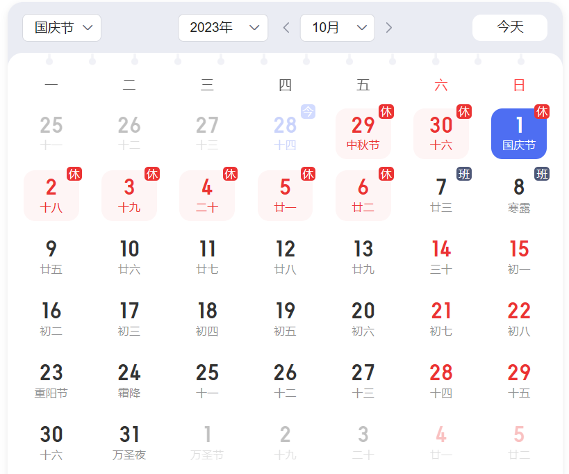2023年中秋節、國慶節放假時間:9月29日至10月6日放假調休8天。