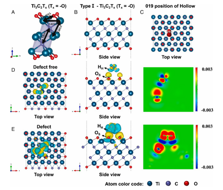 2 分子在最低能量 019 空心吸附位點(diǎn)處吸附行為的頂視圖。無缺陷體系 (D) 和 Ti 缺陷體系 (E) 下 Ti