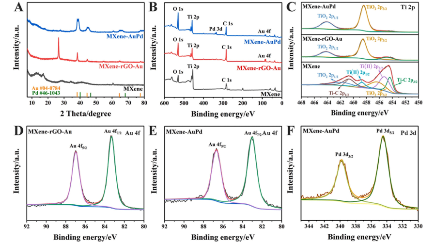 圖2. (A) MXene、MXene- rGO - Au和MXene- AuPd納米復合材料的XRD譜圖和(B) XPS譜圖。(C) MXene,MXene-rGO-Au和MXene-AuPd納米復合材料的Ti 2p的高分辨率XPS光譜。MXene-rGO-Au和MXene-AuPd納米復合材料中(D,E)Au 4f的XPS光譜和MXene-AuPd納米復合材料中(F)Pd 3d的XPS光譜。