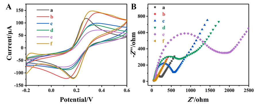 圖3. (A) miRNA-21生物傳感器在含0.1 M KCl的5 mM 溶液中的CV曲線和(B) EIS Nyquist圖:(a) GCE, (b) MXene-rGO-Au/GCE, (c) CP/MXene-rGO-Au/GCE, (d) MCH/CP/MXene-rGO-Au/GCE, (e) miRNA/MCH/CP/MXene-rGO-Au/GCE, (f) MXene-AuPd/miRNA/MCH/CP/MXene-rGO-Au/GCE。