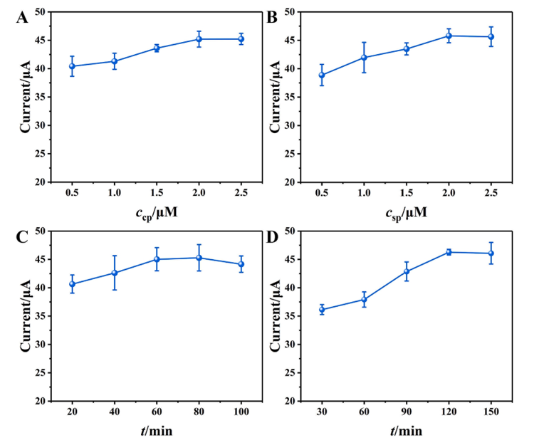 圖4. (A) CP和(B) SP濃度、(C) miRNA-21與CP和(D) miRNA-21與SP的培養時間,與MXene-AuPd連接,對DPV反應的影響。