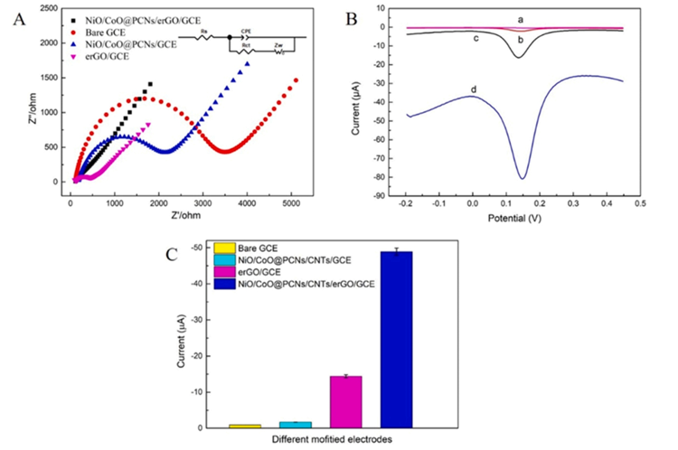 圖2. (A)GCE、erGO/GCE、NiO/CoO@PCNs/CNTs/GCE和NiO/CoO@PCNs/CNTs/erGO/GCE的EIS光譜。配套電解液:0.1 M KCl含1mm ,頻率范圍:0.1 Hz ~ 100khz。(B)在0.1 M PBS (pH = 5.5)中, GCE (a)、NiO/CoO@PCNs/CNTs/GCE (b)、NiO/CoO@PCNs/CNTs/GCE (c)和NiO/CoO@PCNs/CNTs/erGO/GCE (d) 的10 μM DA的DPVs。(C)不同電極的氧化還原峰值電流。
