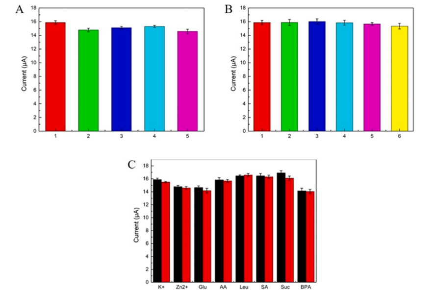 圖6. (A) 5個電極在相同條件下的重復性研究。(B)相同條件下六種平行測定方法的穩定性研究。(C)一些可能的干擾物質對PBS溶液中5μm DA測定的影響。