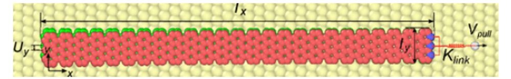 圖1. 計算模型示意圖。GNR被放置在Au(111)表面的基板上,并被跟蹤以沿著X軸方向移動。GNR末端的第一排原子(藍(lán)色)通過剛度Klink=1.5N/m的線性彈簧連接到虛擬原子(白色)。尾部擺動的特征是Uy,它測量滑動過程中的尾部橫向位移