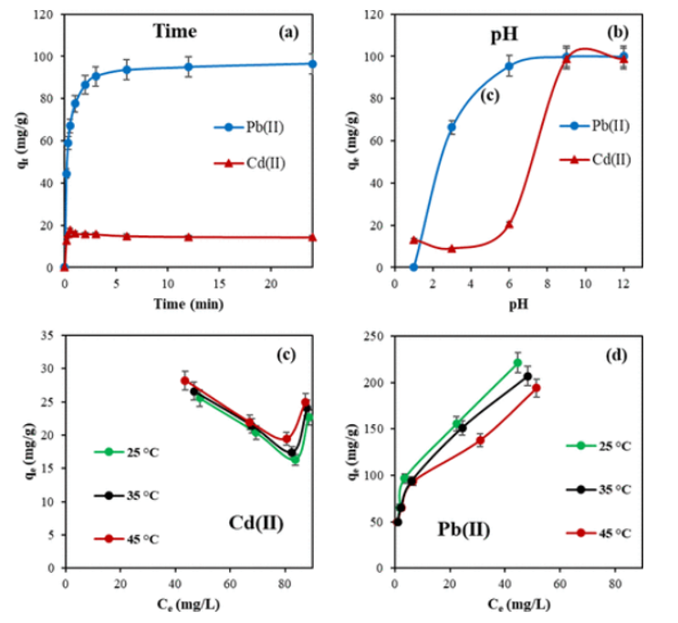 圖6.(a)接觸時間、(b)pH和溫度對(c)Cd(II)和(d)Pb(II)吸附的影響。
