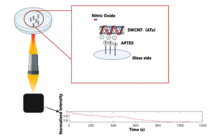 半導體單壁碳納米管(s-SWCNT)是在近紅外區域發出熒光的結構。通過用聚合物材料如單鏈DNA涂覆SWCNT表面,在試劑存在的情況下發生熒光發射的變化。通過這種方式,聚合物涂覆的SWCNT結構允許它們用作單分子檢測的光學傳感器。特別是今天,細胞分子檢測方法的不足使得癌癥等疾病的早期診斷在單分子水平上變得困難。在這項研究中,在單分子水平上檢測作為癌癥標志物的一氧化氮(NO)信號。在這種情況下,通過用具有不同寡核苷酸長度(AT)的ssDNA涂覆7,6-手性s-SWCNT表面來形成傳感器結構。利用紫外-可見光譜和拉曼光譜顯微鏡對傳感器結構進行了表征。在傳感器結構形成后,使用各種分子創建選擇性文庫。由于SWCNT(7,6)表面的DNA電暈相形成,觀察到195和276 cm–1處的拉曼峰向右移動。此外,選擇性文庫結果表明(AT)30序列可用于NO檢測。使用SWCNT(7.6)-(AT)30進行的研究結果表明,該傳感器對NO的檢測限(LOD)和測定限(LOQ)值分別為1.24和4.13μM。