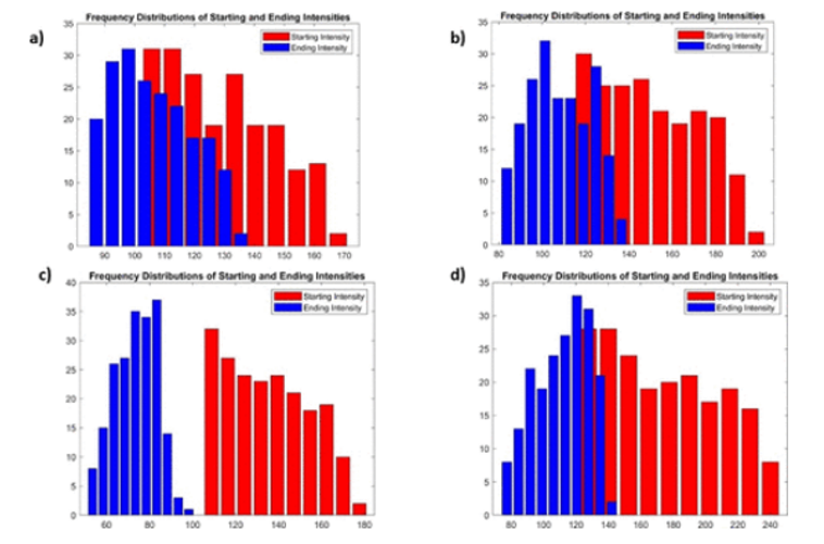 圖5. 不同濃度的Mahma壬酸鹽(a)2.5μM,(b)5μM、(c)10μM和(d)20μM時的熒光變化。
