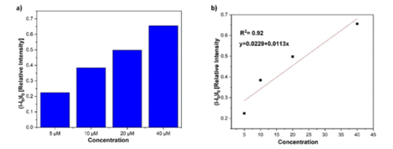 圖6. (a) 不同濃度NO下的熒光相對強度圖和(b)相關測量的校準圖。