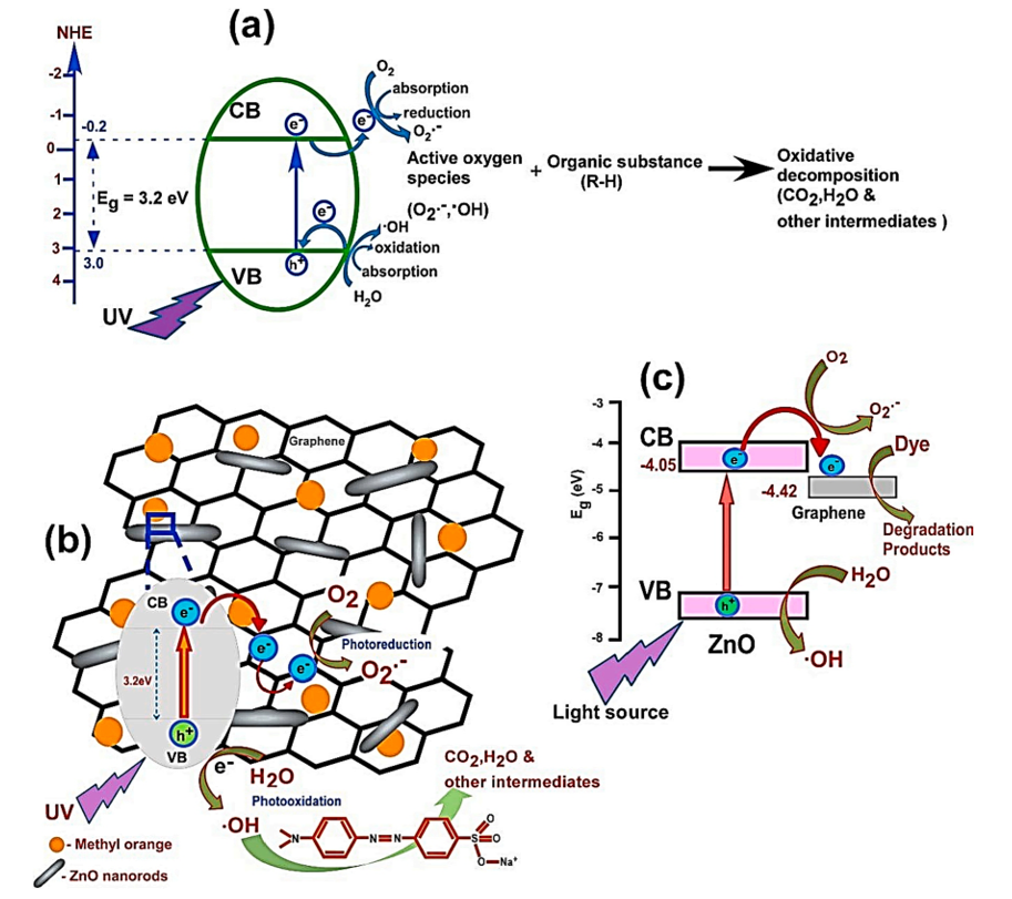 圖3. (A) ZnO和(B) GN-ZnO的光催化機理,(C) GN-ZnO的光催化帶。