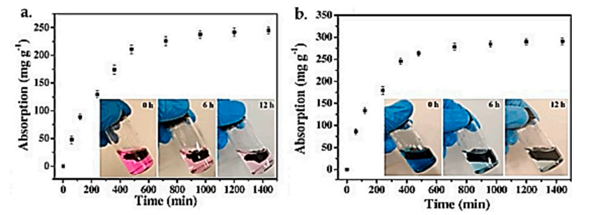 圖7. 黃原膠/氧化GN (XG/GO-1)混合物氣凝膠去除有機染料:(a)羅丹明B吸附(RB)。亞甲藍吸附(b) (MB)。