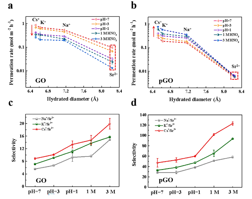 圖3. 不同酸性條件下膜的篩分性能。(a)GO和(b)pGO膜上離子的滲透率與離子水合直徑的關系。(c)GO和(d)pGO膜上離子的選擇性隨酸條件的變化。