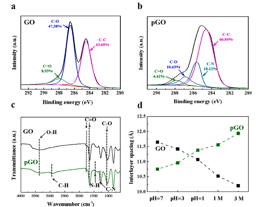 圖2. 膜的化學特性。(a)GO膜的XPS Cls光譜擬合結果。(b) pGO膜的XPS Cls光譜擬合結果。GO膜和pGO膜的(c)FTIR光譜和(d)不同酸性條件下層間間距的變化。