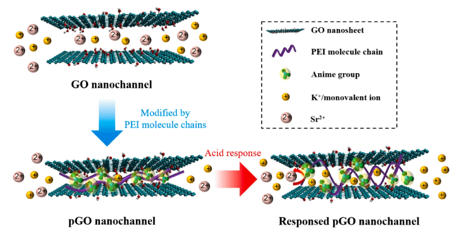 2+核素離子。與傳統氧化石墨烯膜不同的是,由于修飾后的pGO納米通道內存在接枝分子聚乙烯亞胺(PEI),因此pGO膜的層間間距可以隨著周圍溶液酸度的增加而調節和增加。由此產生的酸性環境適應性膜在高酸性溶液中具有擴大和帶正電的納米通道。這種結構有效地阻斷了較大且高電荷的水合Sr