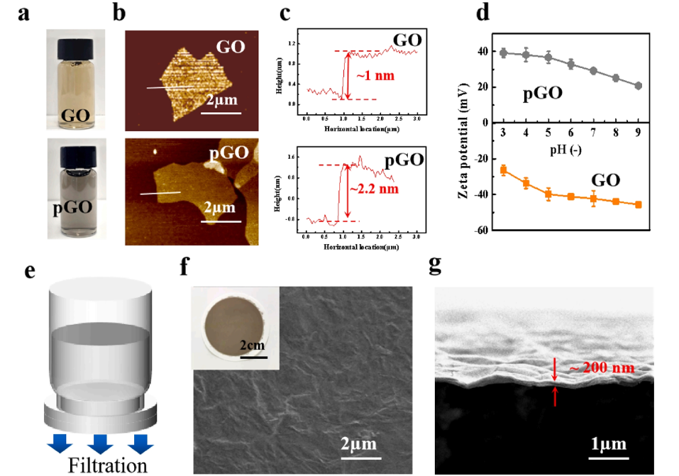 圖1. 納米片和納米膜的形貌表征。(a)GO和pGO懸浮液的光學照片。(b)GO和pGO納米片的原子力顯微鏡圖像。(c)GO和pGO納米片相應的高度分布圖。(d)不同ph值下GO和pGO懸浮液的Zeta電位。(e)膜的制備過程示意圖。(f) pGO膜的表面SEM圖像,插圖為pGO膜的光學照片。(g)pGO膜的橫截面SEM圖像。