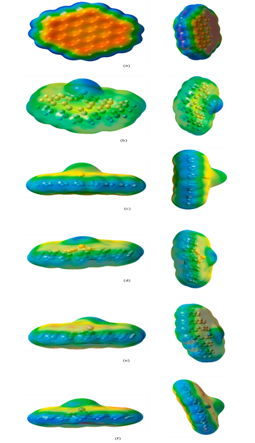 圖5. 使用B3LYP/LANL2DZ的原始和金屬摻雜石墨烯系統的分子靜電勢表面。