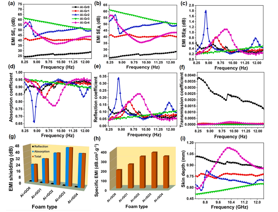圖5. (a)總EMI SE (SET), (b)吸收屏蔽效能(SEA), (c)反射屏蔽效能(SER), (d)反射系數,(e)透射系數,(f)吸收系數,(g)不同Al-rGO泡沫的SET、SEA和SER的比較,(h)絕對比屏蔽效能(SSEt), (i) Al-rGO泡沫的趨膚深度。