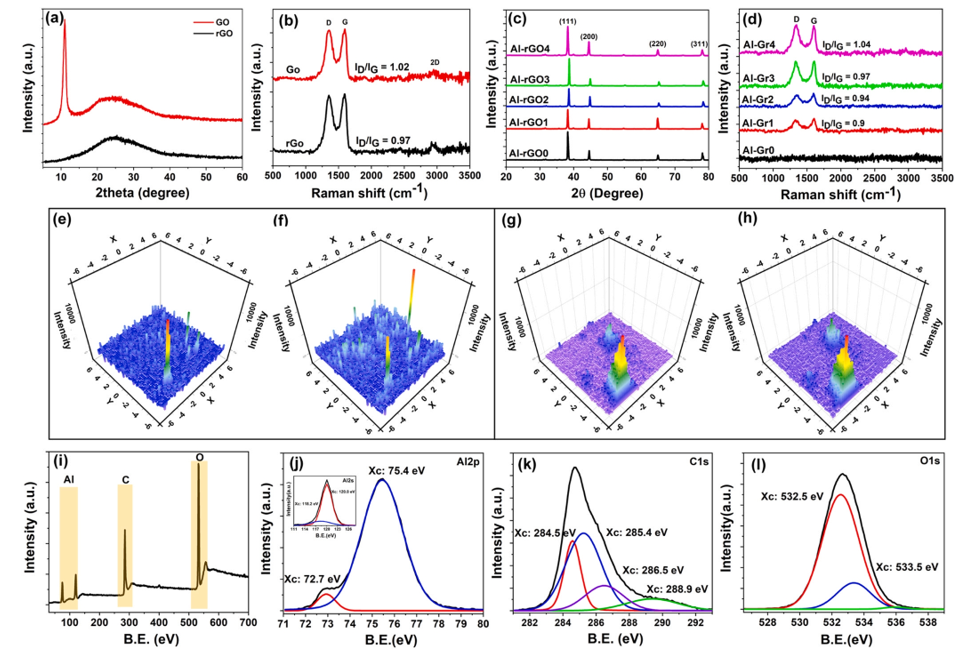 圖3. (a) GO/rGO的XRD譜圖,(b) GO/rGO的拉曼光譜,(c) Al-rGO泡沫的XRD譜圖,(d) Al-rGO泡沫的拉曼光譜,(e-f) Al-rGO3泡沫和(g-h) Al-rGO4泡沫的拉曼映射圖譜,(i-l) Al-rGO3泡沫的高分辨率XPS譜圖。