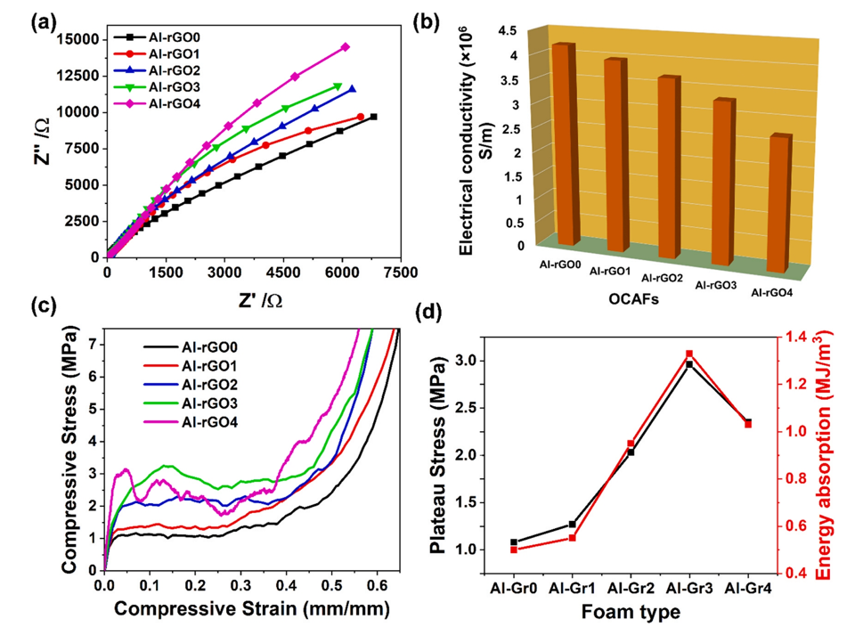 圖4. (a) EIS譜,(b) OCAFs電導率,(c)壓縮應力-應變圖,(d)平臺應力和能量吸收。