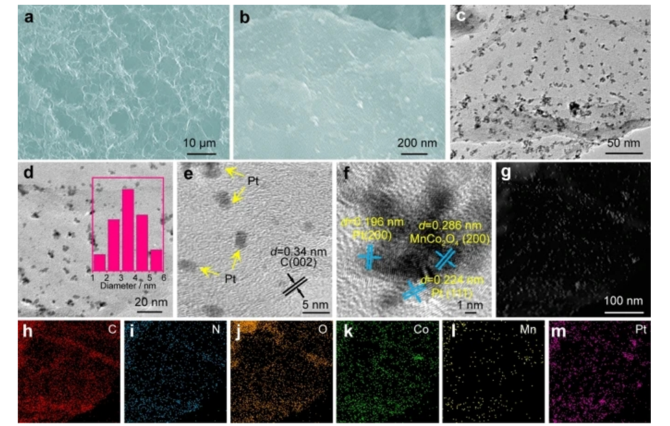 4-NG 網絡上生長的大量超細 Pt 納米粒子,以及(d 中的插圖)尺寸Pt納米晶的分布; g HAADF-STEM 和 h C、i N、j O、k Co、l Mn 和 m Pt 的元素映射圖像。