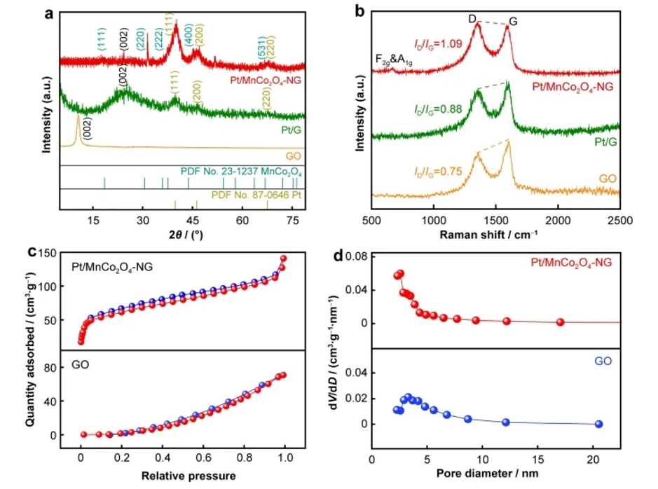 4-NG、Pt/G和GO樣品的XRD圖譜和b拉曼光譜; c Pt/MnCo