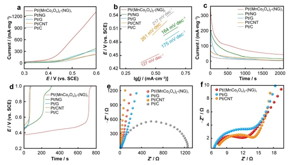 1、Pt/NG、Pt/ G、Pt/CNT 和 Pt/C 電極的 a LSV 曲線、b 塔菲爾圖、c 計時電流和 d 計時電位響應,其中用于計時電位測試的電流是通過在 0.5 V 下正向掃描相應 CV 曲線獲得的; e, f Pt/ (MnCo