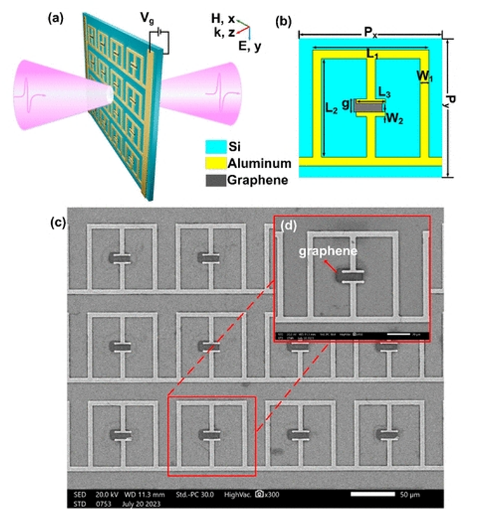 太赫茲(THz)場增強在高分辨率成像、下一代無線通信和網絡中有著重要的應用。在這項工作中,本研究實驗證明了基于谷間散射理論的用于太赫茲場增強的石墨烯超表面。元表面的每個元原子由嵌入一個石墨烯片中的一個分裂環諧振器(SRR)組成。實驗結果表明,通過電調節石墨烯貼片的導電性,整個樣品的太赫茲場增強了23倍,0.47THz處的透射振幅降低了8.4dB。此外,在0.43THz處的最大相位差達到88°。實驗結果與仿真結果吻合良好。這項研究為探索太赫茲-物質相互作用和非線性光學鋪平了道路。