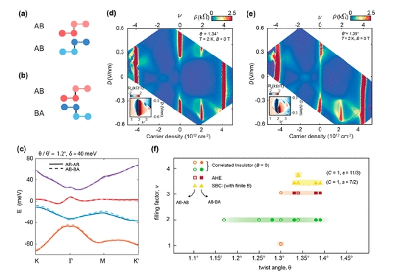 圖1. 在兩種堆疊配置中,在tDBG中觀察到的相關(guān)相位和拓?fù)湎辔坏膶哟?。(a,b)AB–AB和AB–BA tDBG的側(cè)視圖晶格示意圖。AB–AB(AB–BA)tDBG由兩個(gè)具有相同(相反)取向的Bernal堆疊石墨烯雙層組成。(c) 計(jì)算出θ=1.2°(AB–AB,實(shí)線)和θ′=1.2°的能帶結(jié)構(gòu)(AB–BA,虛線)tDBG,層間電位δ=40meV。紅色帶表示最低莫爾導(dǎo)帶。AB–AB(AB–BA)疊加中的Chern數(shù)為C=2(1)。(d,e)θ=1.34°(AB–AB)和θ′=1.39°(AB-BA)裝置的電阻率ρ