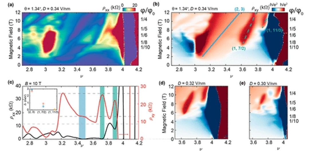2。SBCI由綠色陰影強(qiáng)調(diào)。附近的量子化(2,3)Chern絕緣體由藍(lán)色陰影標(biāo)記。插圖顯示了(2,3)、(1,7/2)和(1,11/3)狀態(tài)的熱激活間隙。藍(lán)色菱形表示在D=-0.4 V/nm和B=8 T時(shí)θ′=1.39°AB–BA樣品的數(shù)據(jù)。橙色正方形表示在D=0.4 V/nm和D=9 T時(shí)θ=1.34°AB–AB樣品的數(shù)據(jù),黃色圓圈表示在D=0.34 V/nm、B=9 T時(shí)同一θ=1.34℃AB–AB樣本的數(shù)據(jù)。(D,e)ρ
