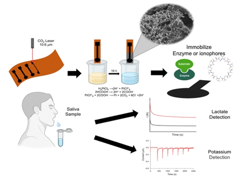 基于唾液的傳感器在醫(yī)學(xué)診斷和運(yùn)動(dòng)醫(yī)學(xué)中變得越來越重要,因?yàn)樵谝后w中發(fā)現(xiàn)了大量生物醫(yī)學(xué)相關(guān)的分析物,并且傳感方案具有固有的非侵入性。唾液乳酸和鉀已被證明是監(jiān)測疲勞、水合作用和整體健康的關(guān)鍵指標(biāo),經(jīng)常監(jiān)測對預(yù)防性治療策略至關(guān)重要。低成本測試條傳感器結(jié)合唾液拭子采樣可以實(shí)現(xiàn)這種頻繁的監(jiān)測,為此,本研究開發(fā)了使用激光誘導(dǎo)石墨烯(LIG)的乳酸安培和庫倫鉀測試條傳感器,這是一種低成本可擴(kuò)展的石墨烯傳感器開發(fā)制造方法。為了提高傳感器的靈敏度,采用簡單的化學(xué)沉積方法將鉑納米顆粒(nPt)沉積在LIG表面。隨后,使用含有乳酸氧化酶的氧化還原介質(zhì)進(jìn)行乳酸感應(yīng),而使用基于聚合物的離子選擇膜進(jìn)行鉀感應(yīng)。乳酸傳感器靈敏度為33.3±0.9 μA mM