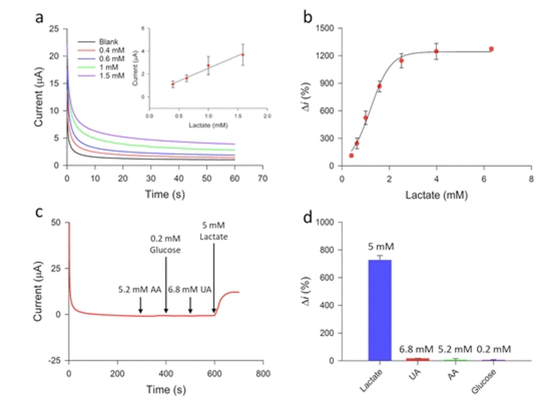 2=0.798)。(b)0.4至6.2 mM乳酸相對于基線的電流變化百分比,顯示2.5 mM后的信號飽和。(c)實(shí)時(shí)選擇性研究顯示5.2 mM抗壞血酸(AA)、6.8 mM尿酸(UA)的電流變化可忽略不計(jì),和0.2mM葡萄糖,然后加入5mM乳酸鹽和大電流增加。(d) 5mM乳酸鹽(藍(lán)色)、6.8mM AA(紅色)、5.2mM UA(綠色)和0.2mM葡萄糖(紫色)的電流相對于基線信號的百分比變化,其中乳酸鹽顯示出最大的電流變化。數(shù)據(jù)表示平均值±標(biāo)準(zhǔn)偏差(n=3)。
