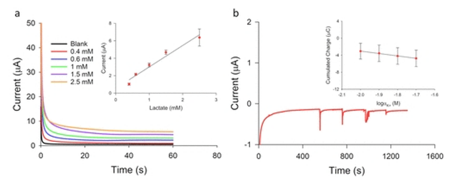 圖1. 用酶或離子載體進(jìn)行功能化后的LIG制備和化學(xué)鍍鉑示意圖。然后使用安培法分析唾液樣本中的乳酸,其中高濃度(紅色曲線)相對于低濃度(黑色曲線)產(chǎn)生更大的電流。鉀檢測采用恒電位庫侖法,在電流脈沖中使用累積電荷進(jìn)行鉀定量。