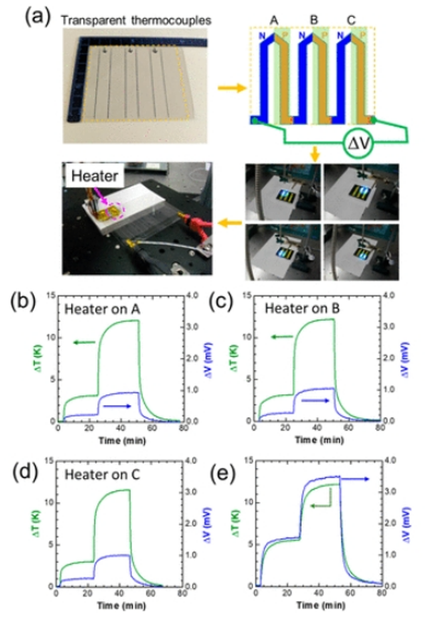 圖5. (a) 制作熱電偶陣列的實驗過程示意圖。PET上的石墨烯被成形為∧形,在頂部形成一個結(jié)。石墨烯∧-結(jié)構(gòu)的一半涂有PBG,然后使用掩模從PET側(cè)進(jìn)行紫外線照射。小型加熱器用于選擇性地加熱一個結(jié)(A、B或C)或所有結(jié)。(b–e)分別顯示熱側(cè)和冷側(cè)之間的溫差以及A、b、C和所有接頭上加熱器的相應(yīng)測量電壓。