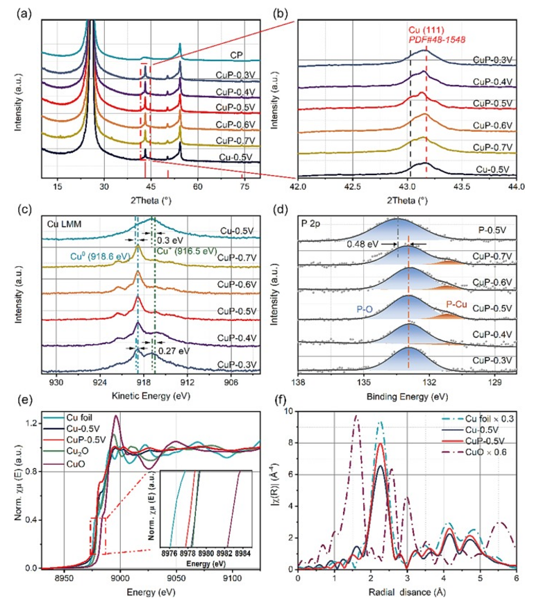 Fig 2. (a) XRD圖譜; (b) 放大的 XRD 圖案; (c) Cu LMM 的 XPS; (d) 在不同電位下電沉積樣品的 P 2p 的 XPS;(e) 銅箔、Cu-0.5 V、CuP-0.5 V、Cu