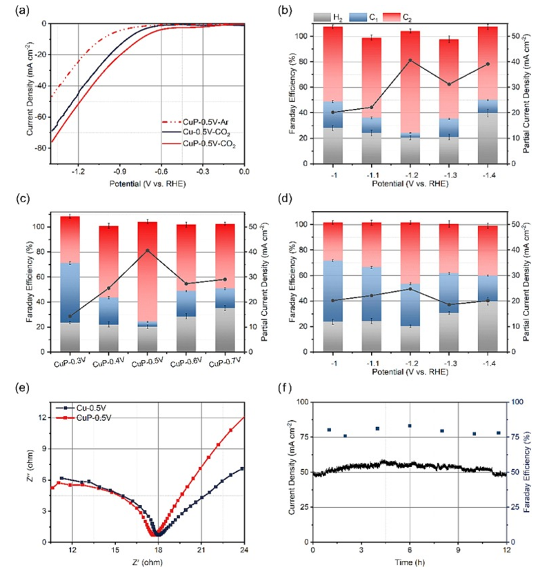 2 飽和電解質中 Cu-0.5 V 和 CuP-0.5 V 以及 Ar 飽和電解質中 CuP-0.5 V 的 LSV; (b)不同電位下CuP-0.5 V上的FE和部分電流密度; (c) 在不同電位下電沉積 CuP-xV 的 FE 和部分電流密度; (d) 不同電位下電沉積 Cu-0.5 V 的 FE 和部分電流密度。 (e) Cu-0.5 V 和 CuP-0.5 V 的 EIS。(f) CuP-0.5 V 的 FE