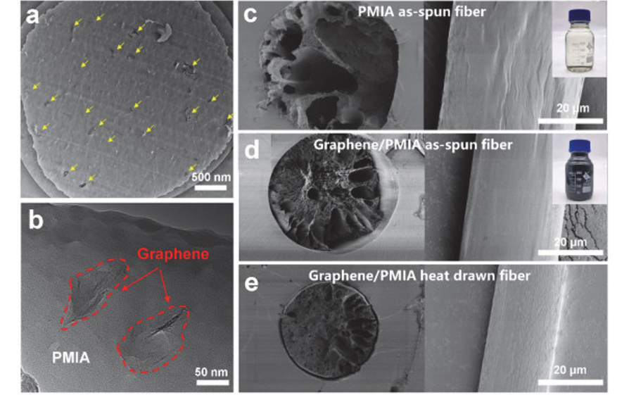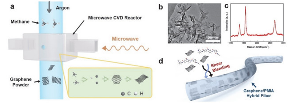 Fig 1. 用于生產亞 1 nm 石墨烯的全物理自上而下方法。 (a) 制造過程示意圖。 (b) SEM 和 TEM 圖像顯示從石墨到 GSN 的尺寸逐步縮小。