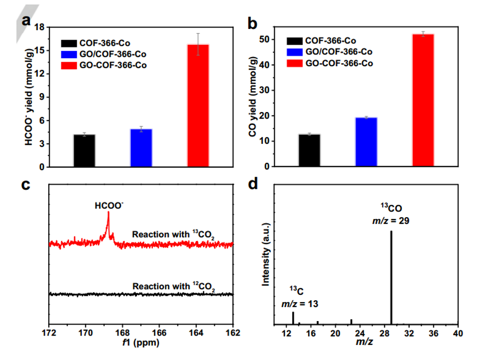 3CN 中反應 8 小時后,HCOO 的產率高于 GO-COF-366-Co、COF-366-Co 和 GO/COF-366-Co。 (b) 在 CH