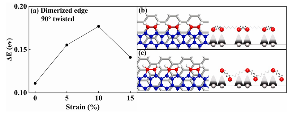 Fig 4. 邊緣釘扎效應對應變工程的穩健性。(a)在具有二聚邊緣的納米湖上,沿x軸的單軸拉伸應變。(b)原子模型和在10 %拉伸應變下滑動屏障最大值的二聚邊緣局部相稱區域的(c)示意圖。薄片的邊緣和內部的碳原子分別用紅色和藍色表示。灰色的線和球代表襯底中的碳原子。