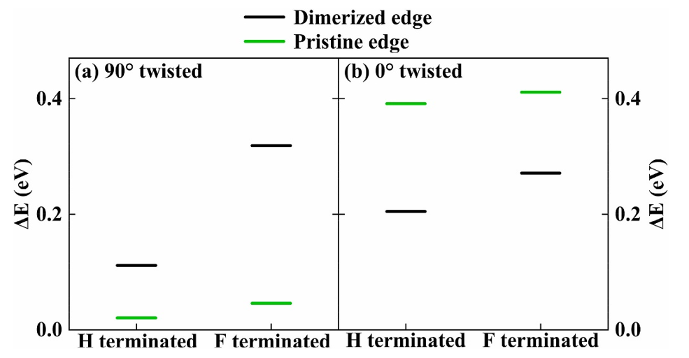 Fig 5. 通過氟化邊緣增強邊緣釘扎效果。 (a) 未對準接觸和 (b) 對準接觸中納米片頂部滑動屏障的行為與邊緣處的 H 和 F 飽和度的對比。