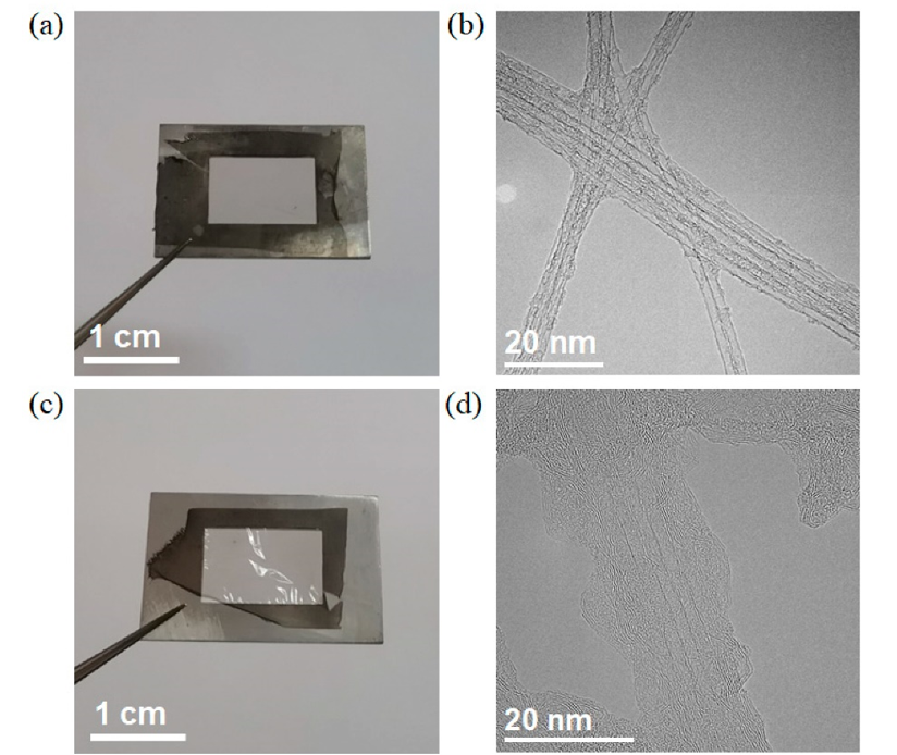 Fig 1. (a,c) h-BN CVD 生長之前和 (c,d) 后 SWCNT 薄膜的光學(xué)圖像和 (b,d) TEM 圖像。