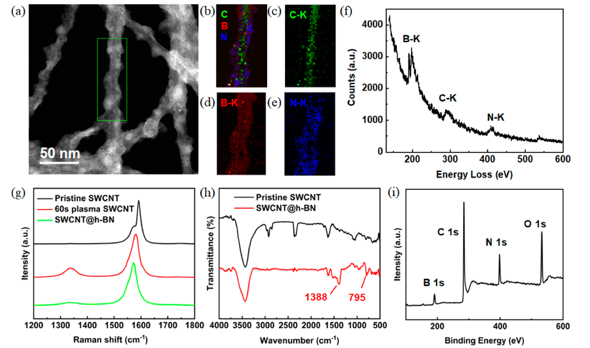 Fig 2. SWCNT@h-BN 的結(jié)構(gòu)表征。 SWCNT@h-BN 的 (a) ADF 圖像、(b-e) EELS 映射和 (f) EELS 譜。 (g) 原始 SWCNT、等離子體處理的 SWCNT 和 SWCNT@h-BN 的 G 和 D 波段拉曼光譜。 (h) 原始 SWCNT 和 SWCNT@h-BN 的 FT-IR 光譜。 (i) SWCNT@h-BN的XPS譜。