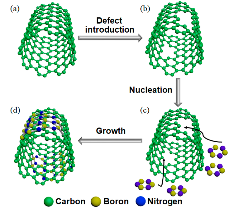 Fig 3. SWCNT@h-BN缺陷誘導(dǎo)異質(zhì)外延生長機(jī)制示意圖。(a)完美的SWCNT。 (b) 有缺陷的單壁碳納米管。 (c) 原子 B 和 N 吸附在 SWCNT 的缺陷上。 (d) h-BN 涂層的 SWCNT。