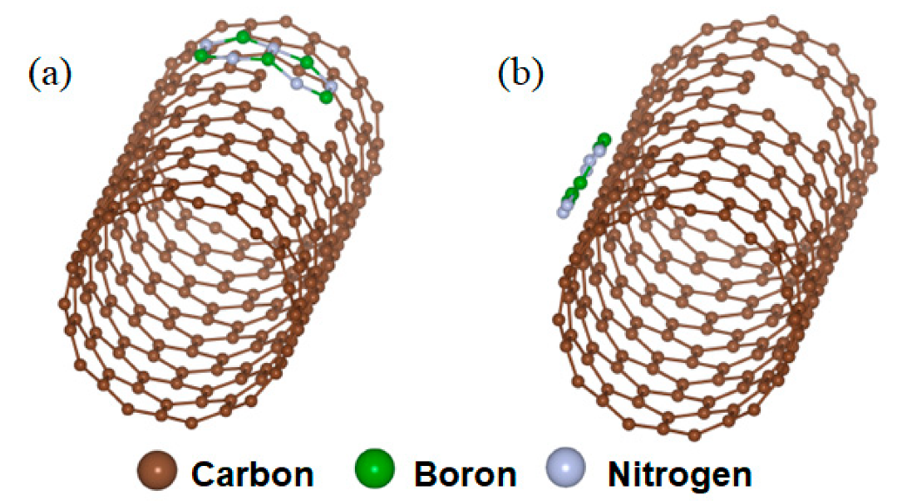 Fig 4. BN 在 SWCNT 壁上吸附的第一原理計(jì)算(a)有缺陷和(b)無缺陷。