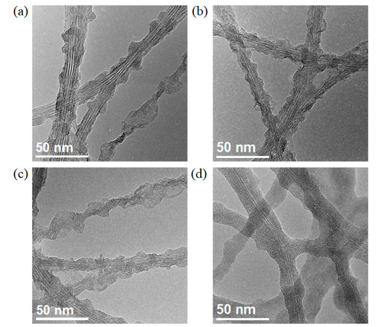 Fig 5. 使用 SWCNT 合成的 SWCNT@h-BN 的電鏡圖像以經(jīng)歷不同的等離子體處理時(shí)間為模板:(a) 20 s、(b) 40 s、(c) 60 s 和 (d) 100 s。