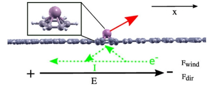 圖1. 在沿表面方向(“橫向”)和電流I施加的電場E中,位于2D碳納米結構頂部的單個原子。原子經歷電遷移力(紅色箭頭),該電遷移力由電場引起的貢獻F