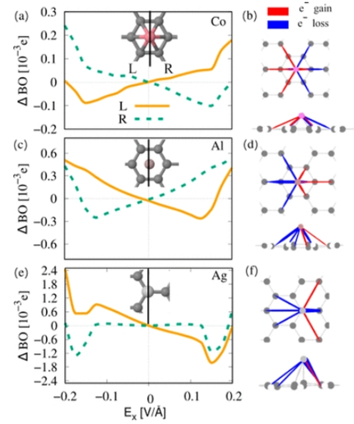 x=0.15eV/Å時誘導鍵電荷的可視化(俯視圖和側視圖),其中藍色表示電子耗盡和紅色積聚。(c,d)對中空位點上的Al進行相同分析,對頂部位點上的Ag進行相同分析。ΔBO描述的原子和表面之間鍵中的電荷再分配預測了場誘導力在原子上的方向。